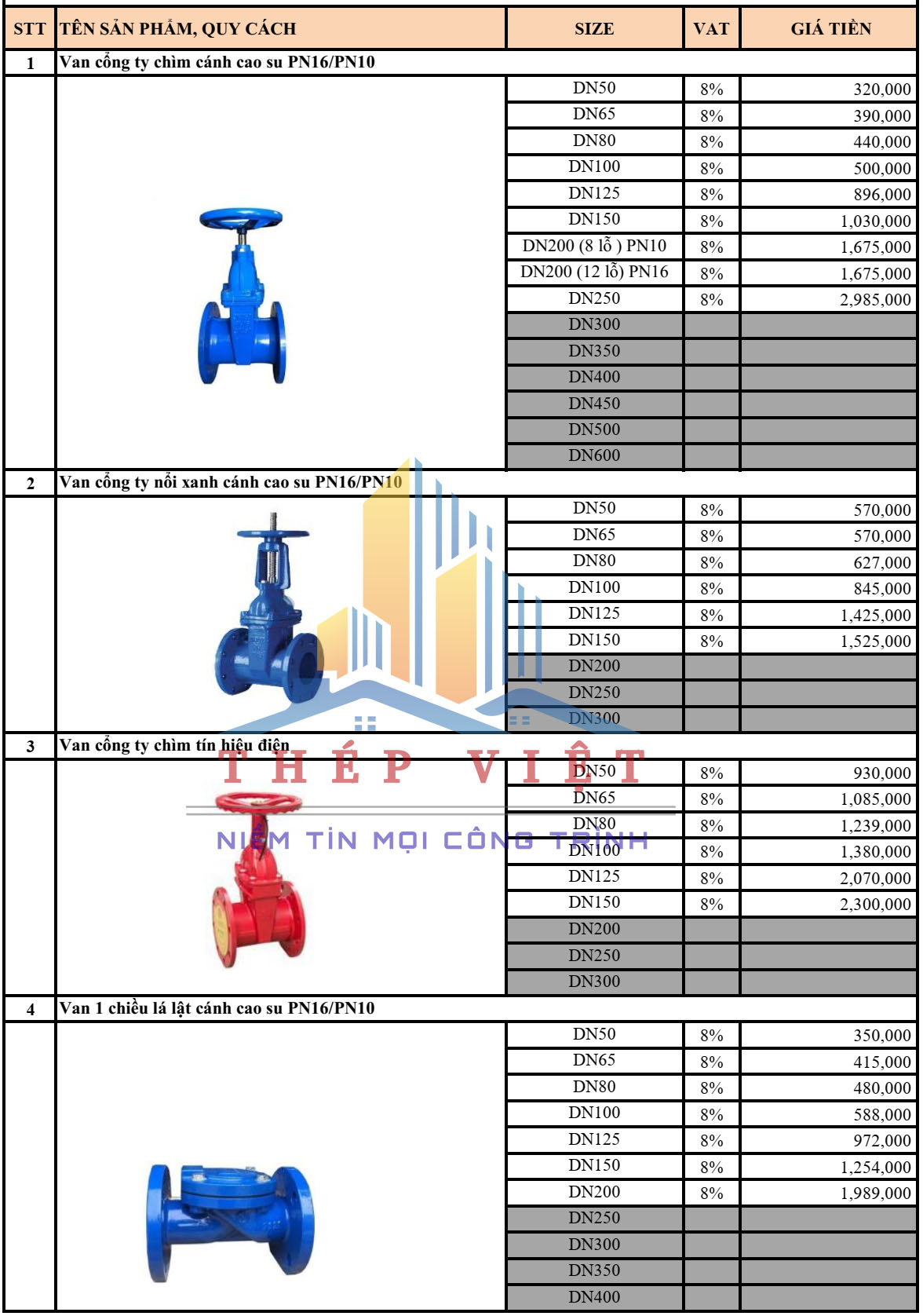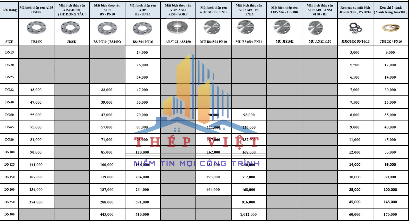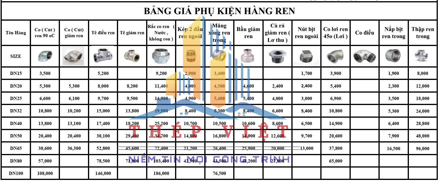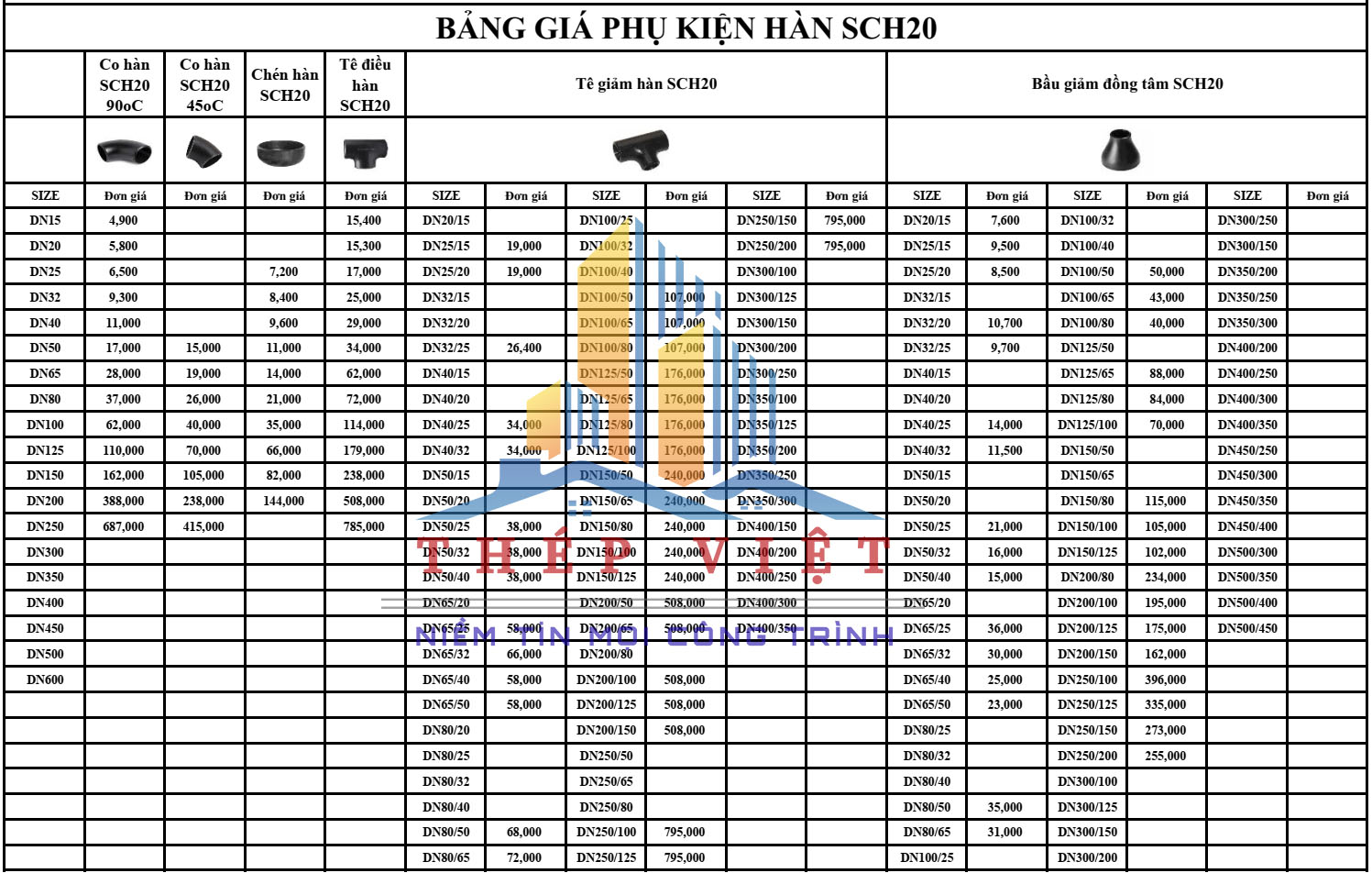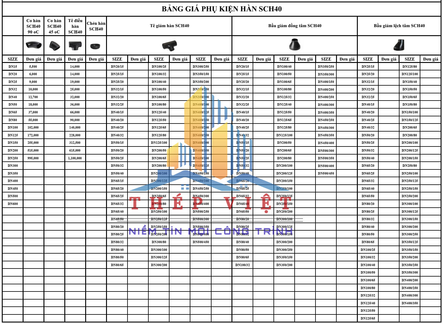Giá phụ kiện ống théo phụ thuộc vào kích thước, độ dày và thời điểm đặt hàng. Dưới đây là bảng giá tham khảo mới nhất do Công ty Thép Việt cập nhật: