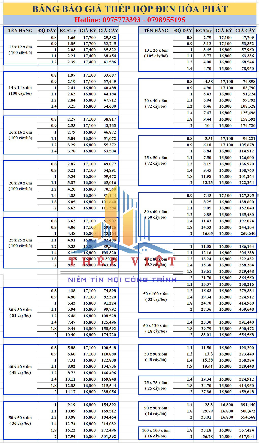 Giá thép hộp đen Hòa Phát thay đổi tùy thời điểm, số lượng và quy cách, tuy nhiên Công ty Thép Việt luôn cập nhật giá trực tiếp từ nhà máy Hòa Phát, đảm bảo mức giá cạnh tranh nhất thị trường.